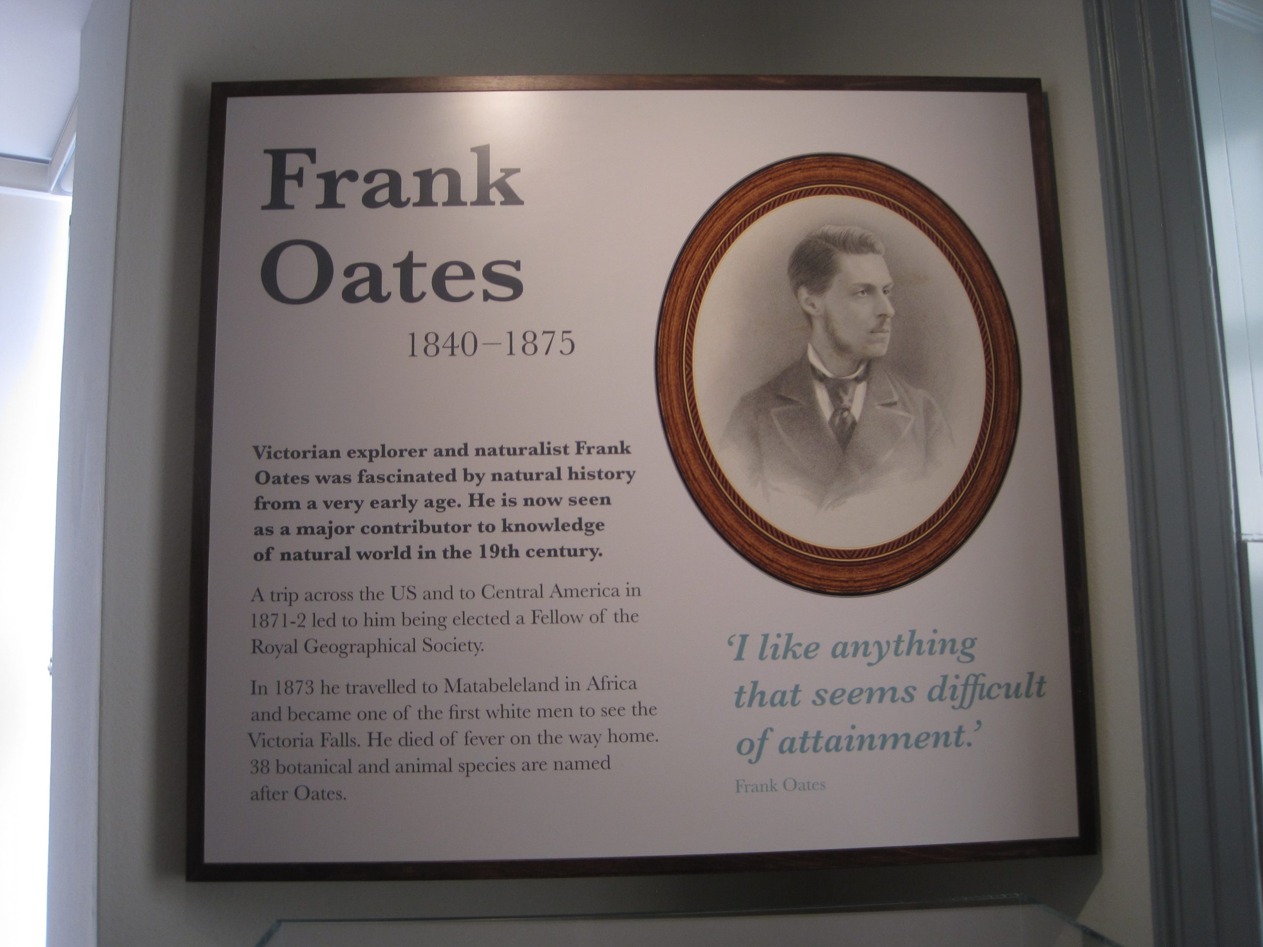 Frank Oates, uncle of Captain Lawrence Oates, is the third of the explorers of the natural world commemorated at Selborne. Frank Oates was a British naturalist and explorer. He was one of the first Europeans to see the Victoria Falls.