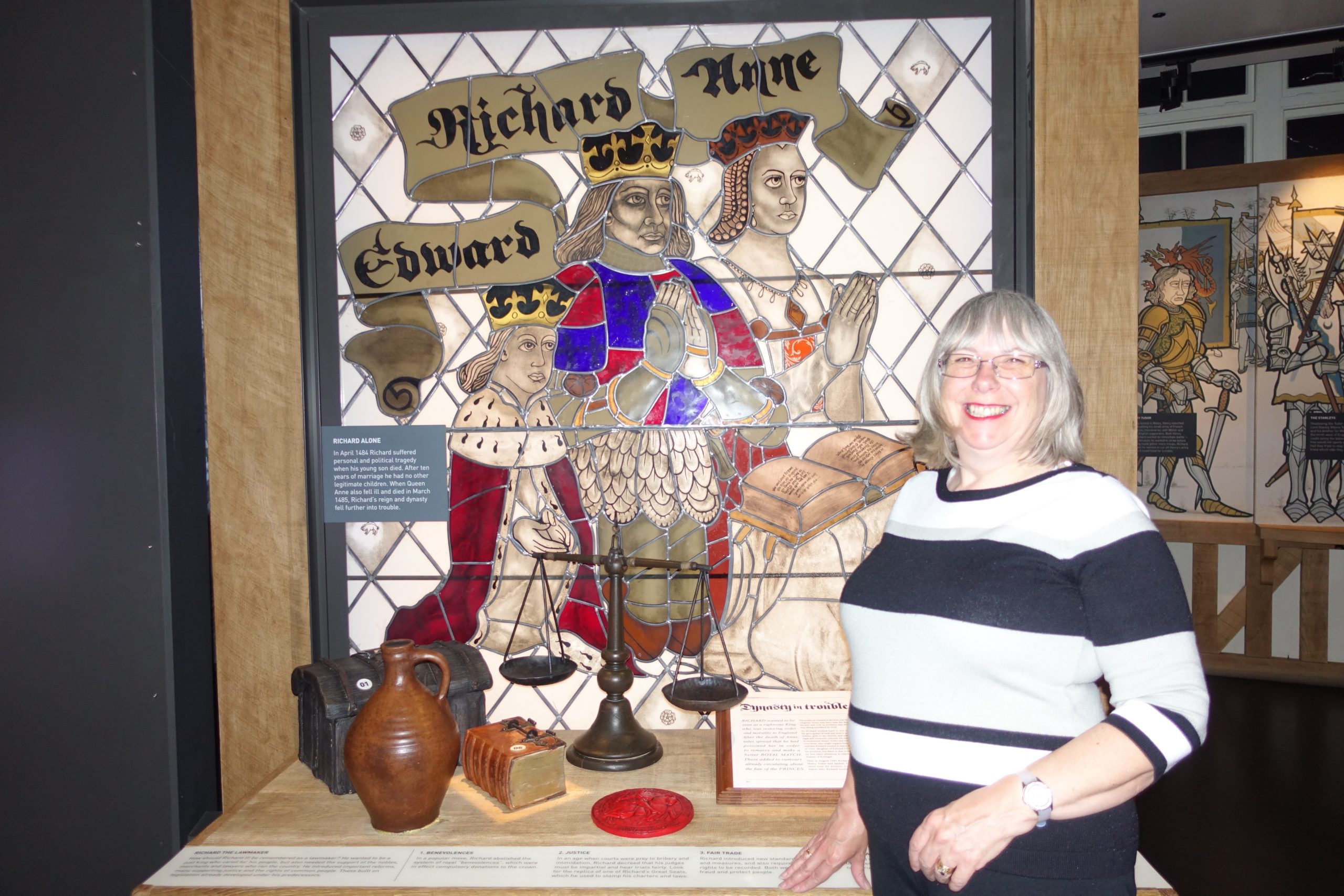 Continuing through the exhibition we learnt about the life of Richard III and how he came to be king. We learnt about his nephews, the Princes in the Tower, and speculation on what happened to them. We discovered Richard’s improvements to the judicial system, safeguarding the rights of the common man. We also learnt about the Battle of Bosworth in 1485, with a film and hand-on exhibition.