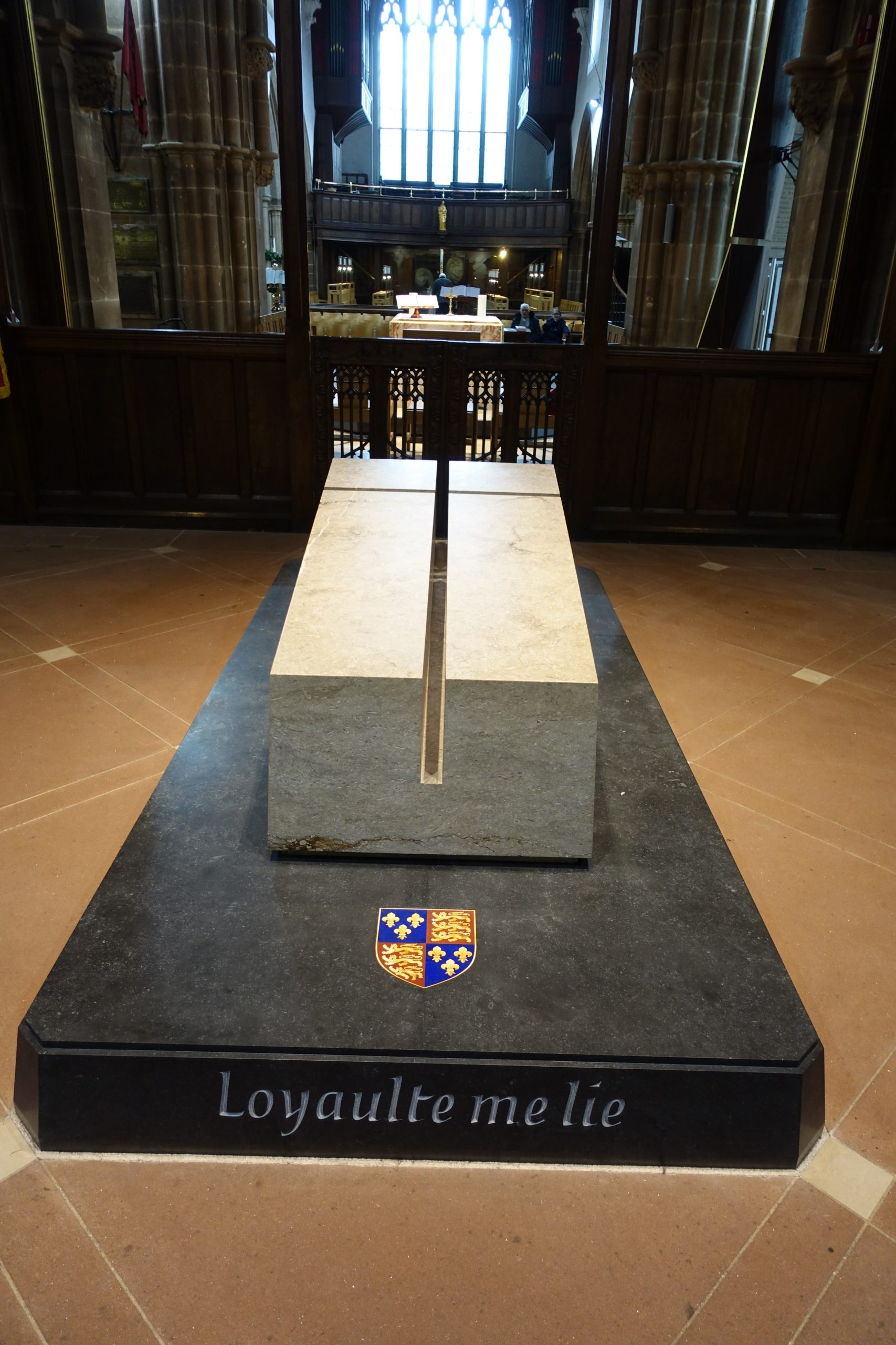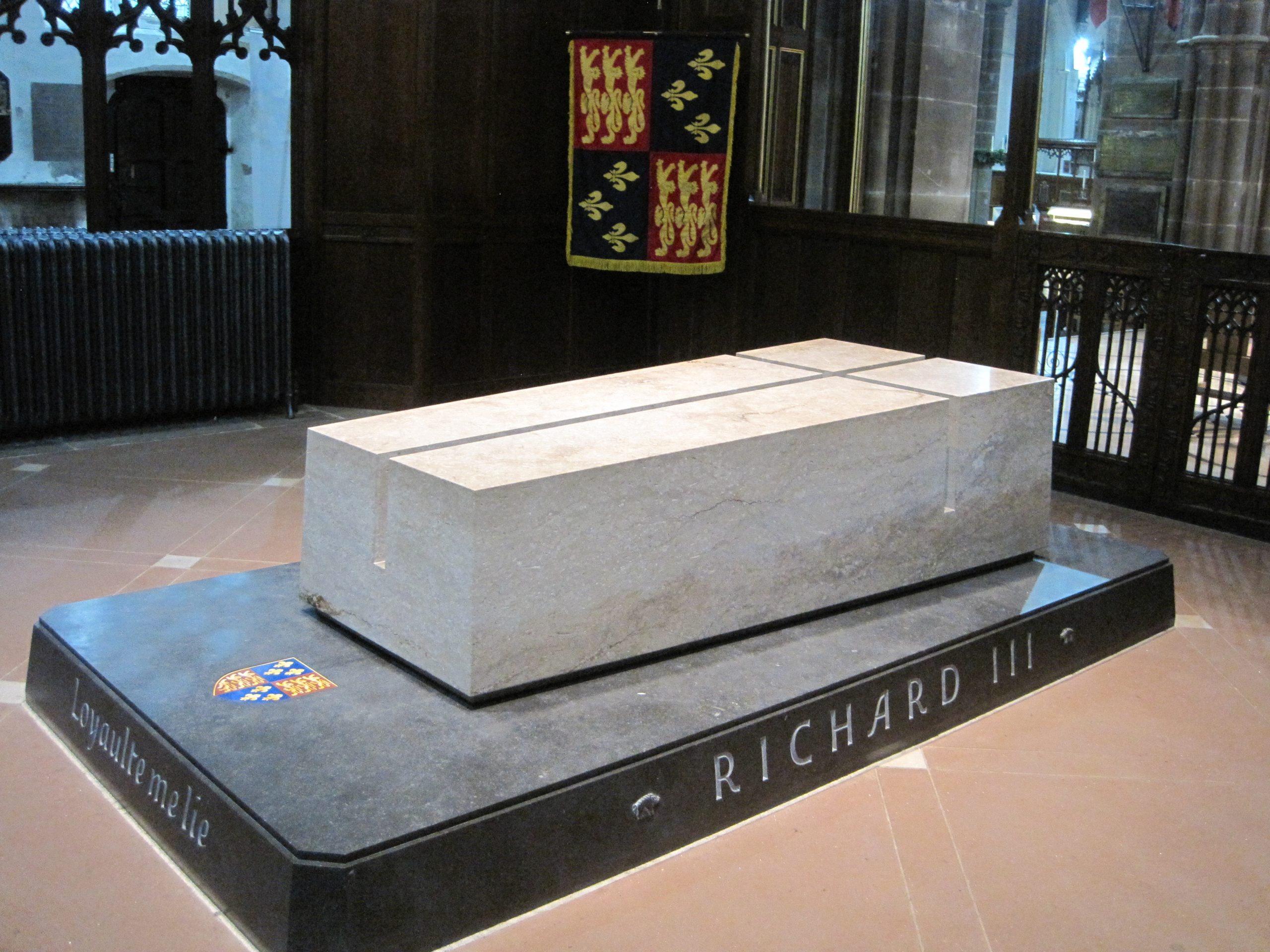 The tomb of King Richard III is made of a single piece of Swaledale fossil stone with a deep cross cut across it. It stands on a Black Kilkenny marble plinth with lettering showing Richard’s name, dates and motto, as well as his personal insignia – a boar.