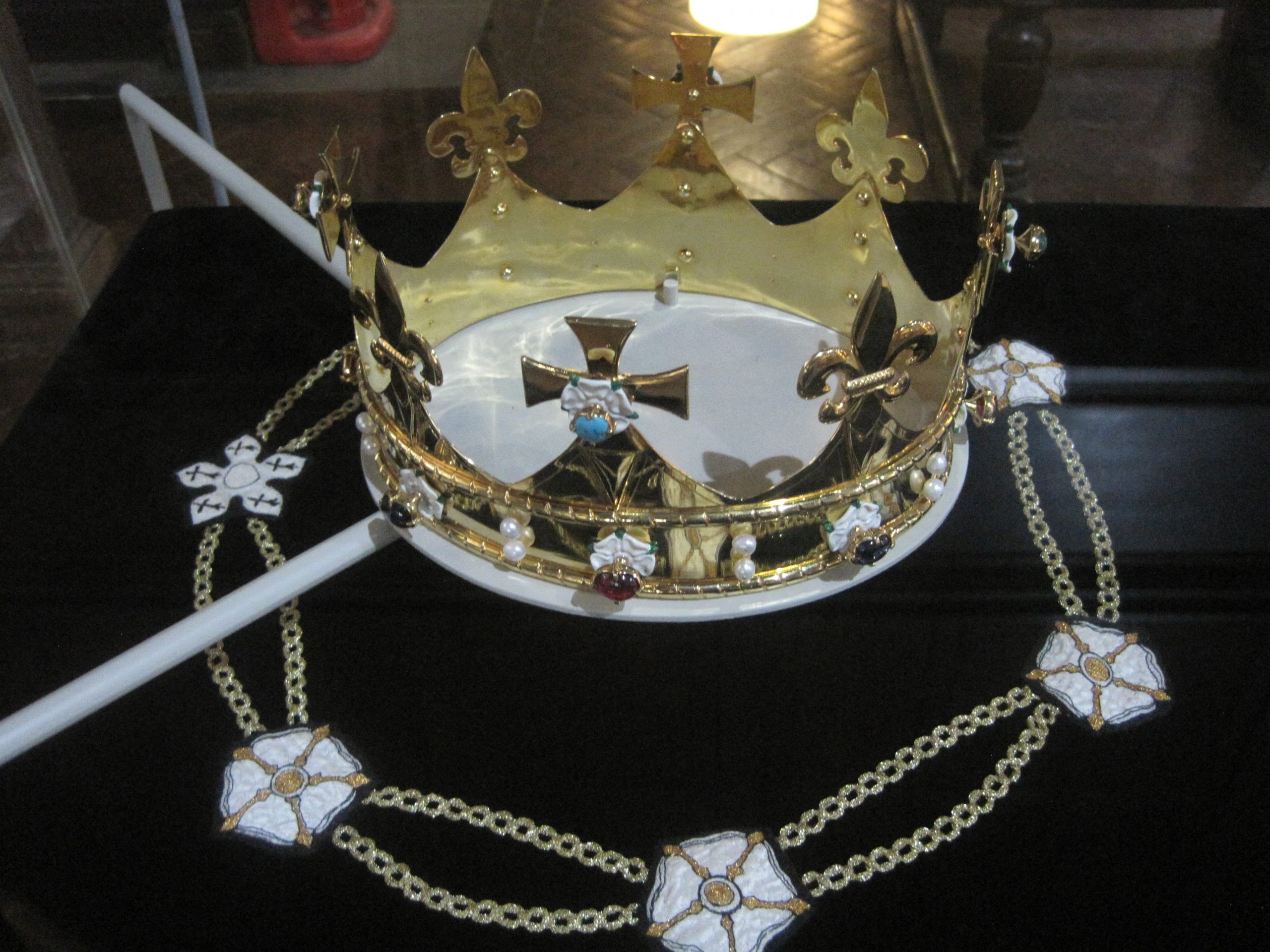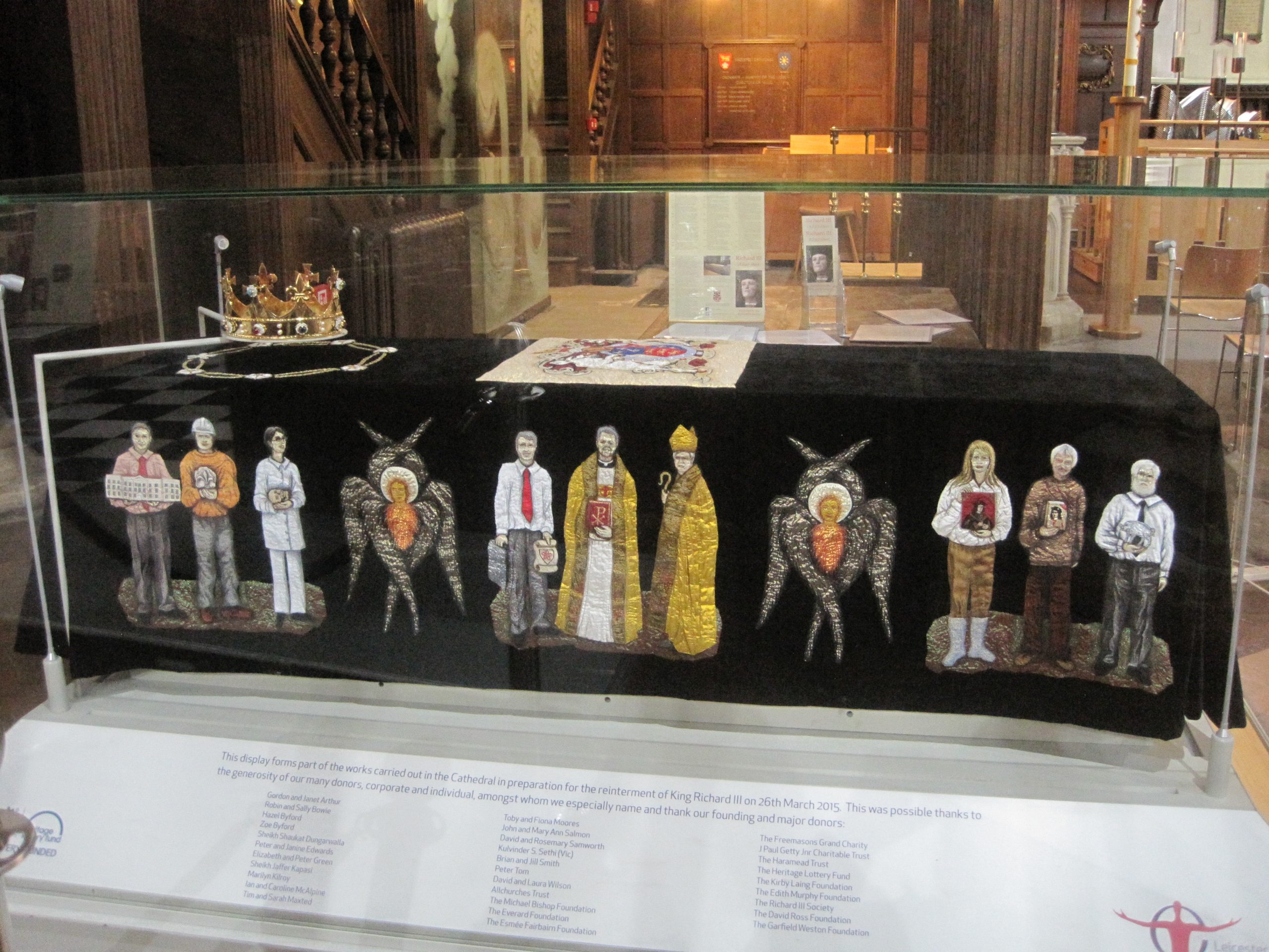 The crown is a replica of the sort King Richard III would have worn. Made by George Easton, it contains semi precious stones and pearls on gilded metal. The pall was made by Jacqui Binns. It has figures embroidered onto black velvet. One side shows medieval characters, the other people connected with the discovery and reinternment.