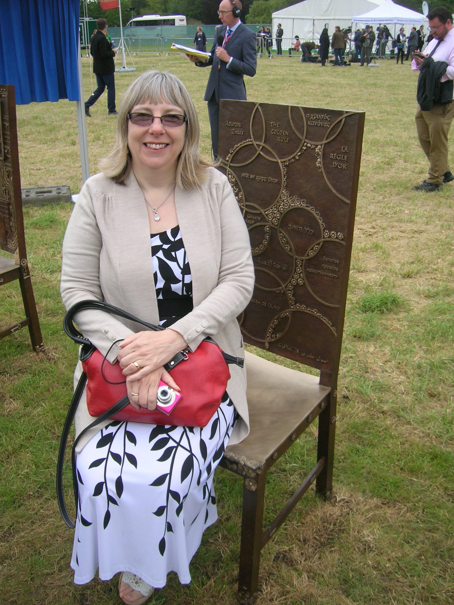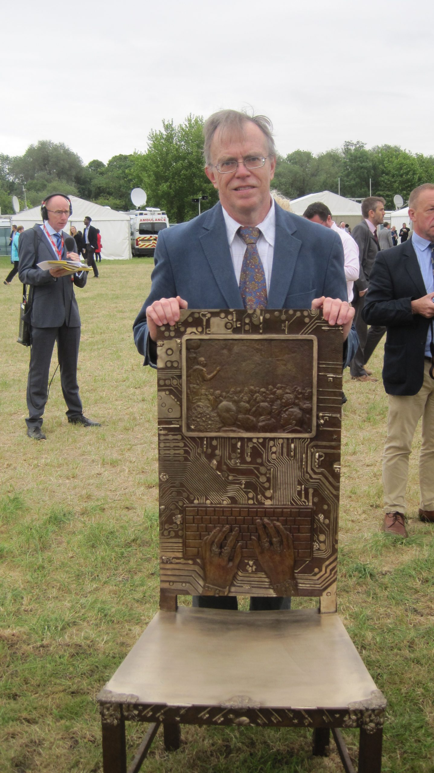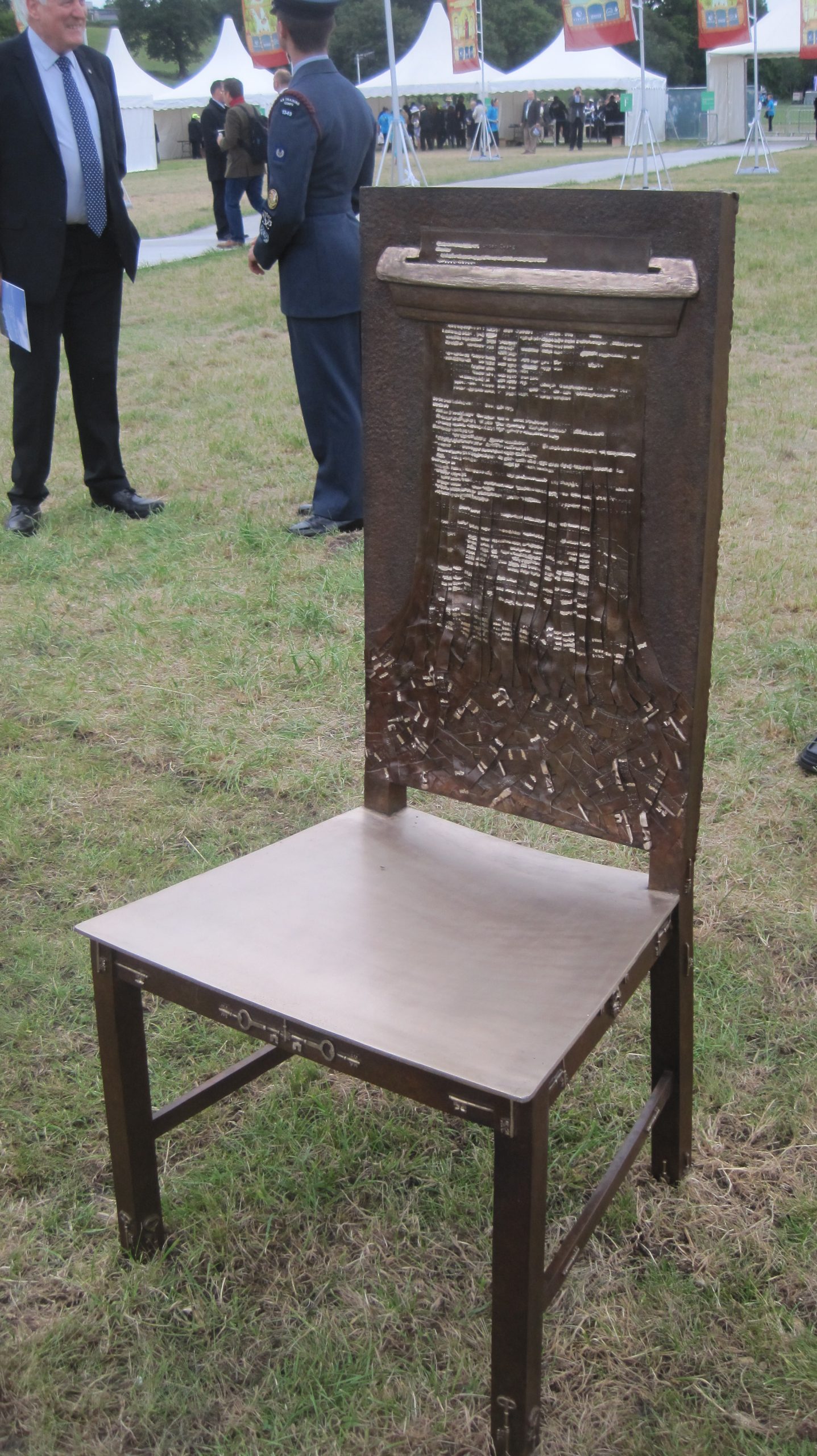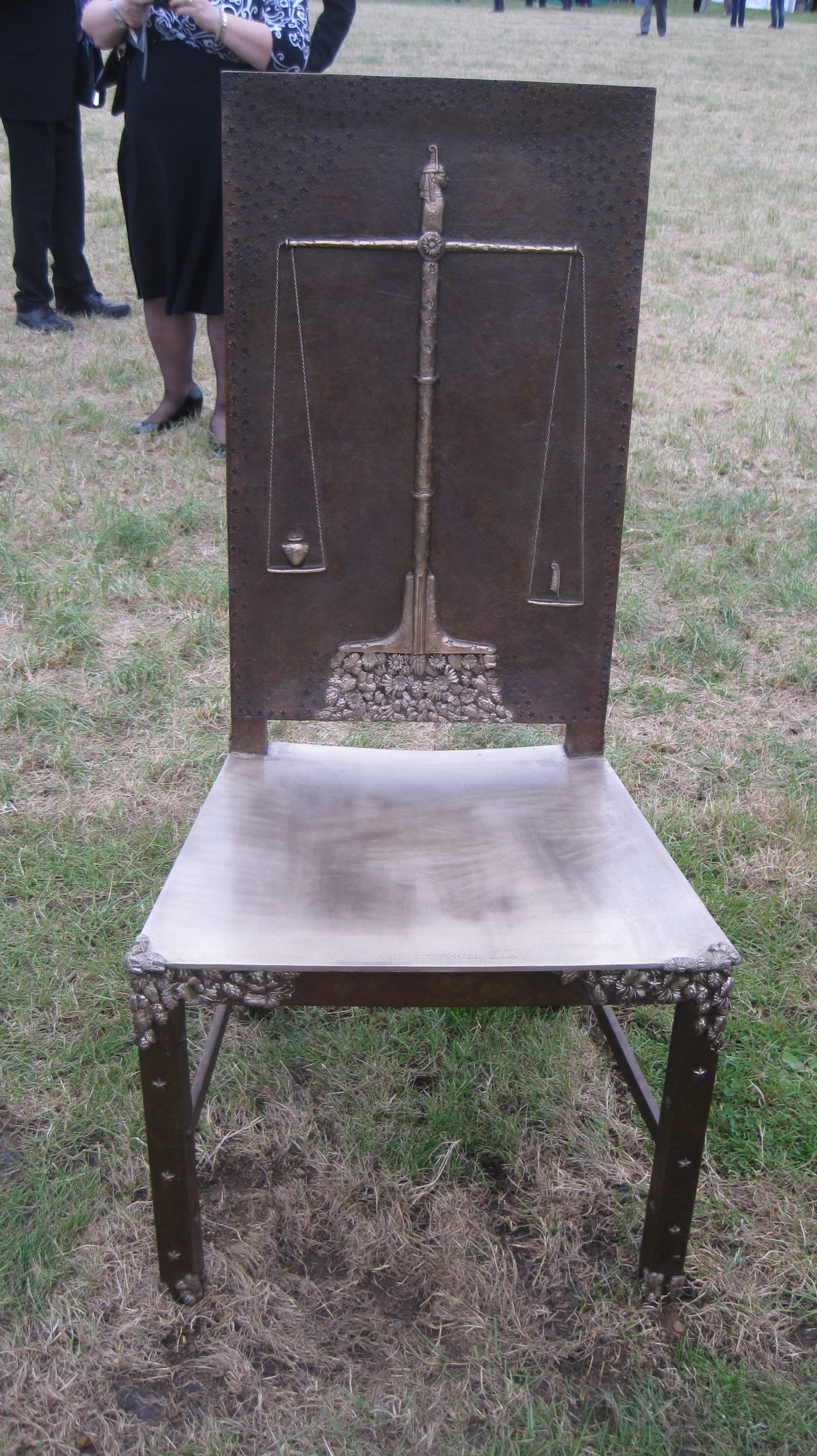 It is formed of 12 bronze chairs, each decorated with panels of images and symbols relating to past and ongoing struggles for freedom, rule of law and equal rights. The Jurors invites visitors to become part of the art. The chairs themselves are set out as an open invitation for visitors to sit down on them, to reflect and discuss together the implications of the histories and issues depicted, and to debate the meaning of justice.