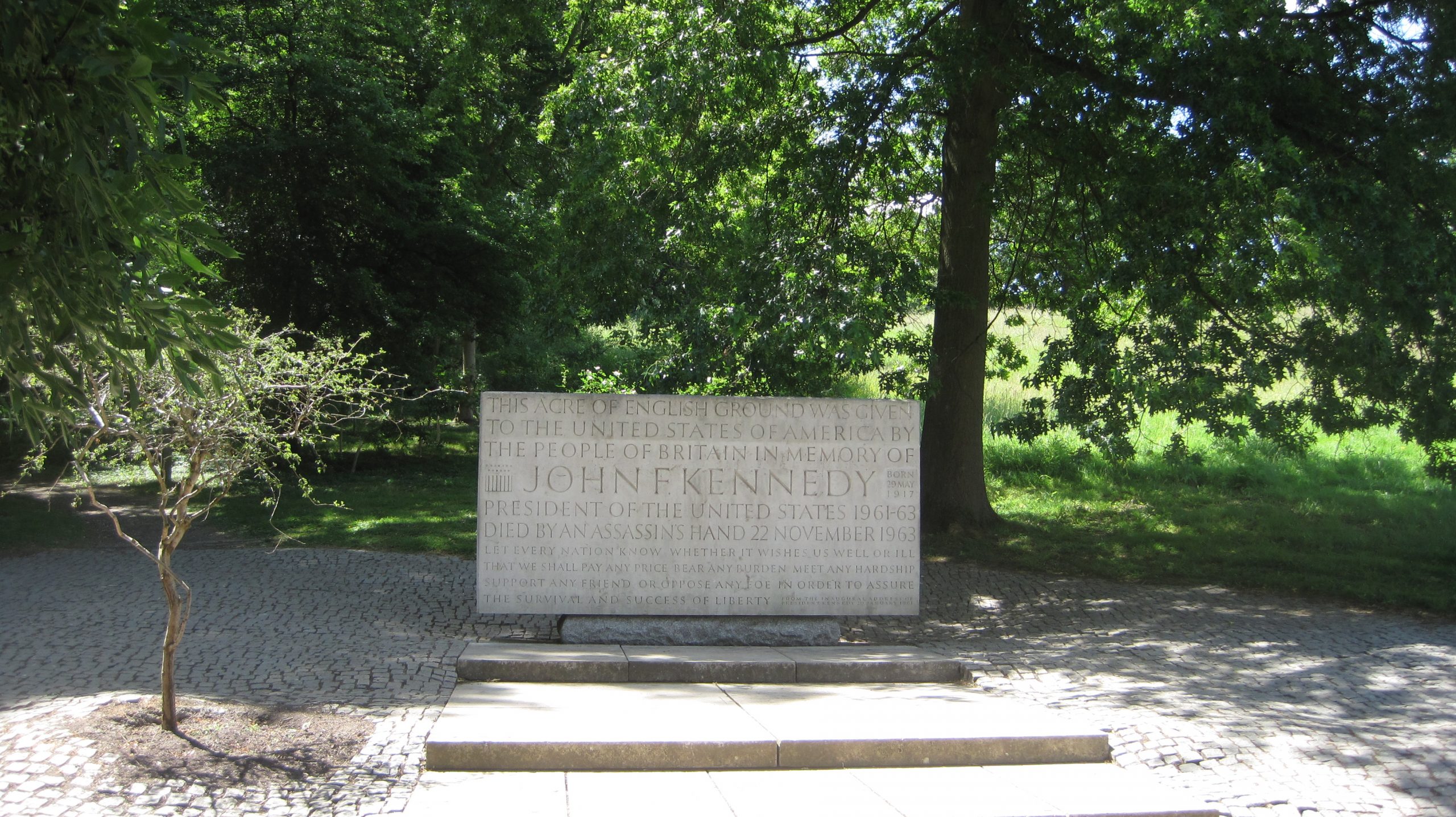 Queen Elizabeth II donated a symbolic acre of land to the United States of America in 1965 which houses the Kennedy Memorial. Designed by Sir Geoffrey Jellicoe, this seven-tonne block of Portland stone is maintained by the Kennedy Memorial Trust.